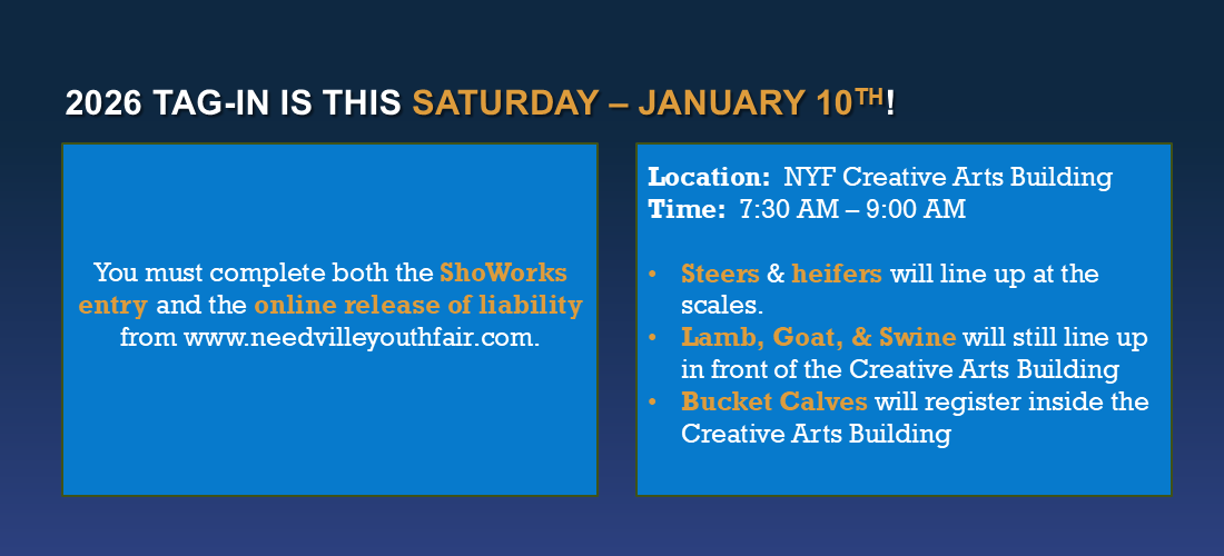 NEW! Livestock & Creative Arts Exhibitors can enter all species at one time. Entries for each species will close one week before each tag in. Exhibitors will only need to register online in ShoWorks. No hard copy forms are required.